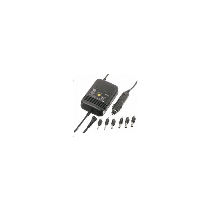 Courant de sortie: 2A Dimensions: 100 x 70 x 32mm Puissance de sortie en continue: 24 VA Tension d'alimentation: 12 - 24V c.c. Tension de sortie: 1,5/3/4,5/6/7,5/9/12V c.c. Type: Portable