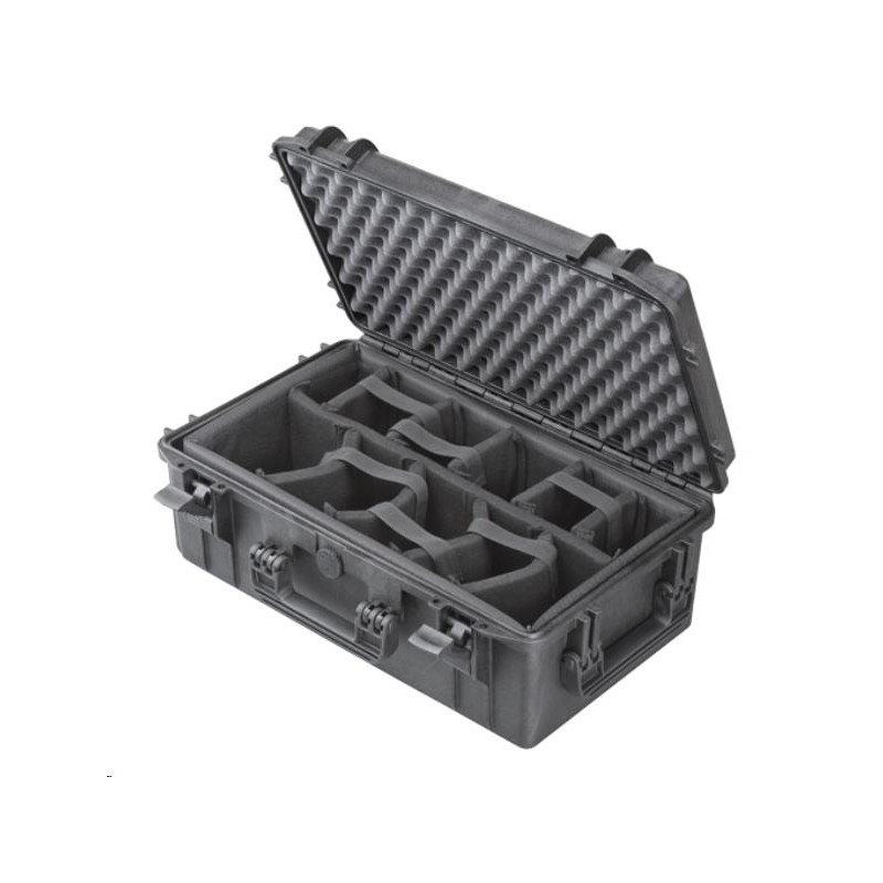 VALISE DE TRANSPORT MAX CASE IP67 NOIRE AVEC CLOISONS MOBILES - ROULETTES ET POIGNÉE TÉLESCOPIQUE - Dimensions Extérieures : 574 x 361 x 225mm - Dimensions intérieures: 520 x 290 x 200mm - Poids: 5.06 kg