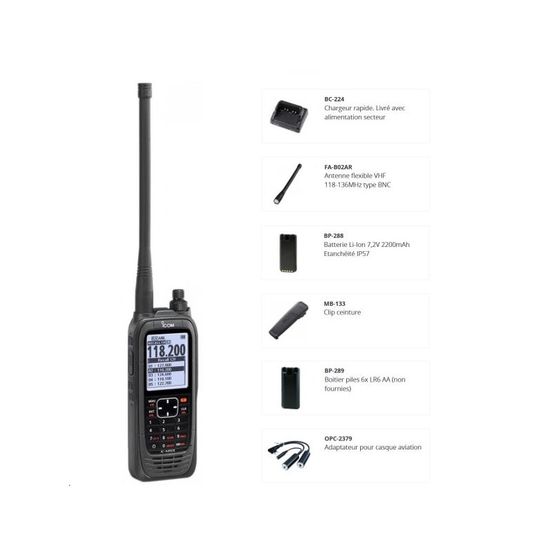 Portatif air ICOM AVIATION IC-A25CE VHF 108-136MHz 6W - 200 canaux avec afficheur LCD et clavier IP57 - Portatif - Chargeur rapide - antenne - clip ceinture - batterie Li-Ion - norme MIL-STD810G - Utilisation au sol ou embarqué comme radio de secours uniquement - Bluetooth, système de navigation, adaptateur double Jack pour casque aéro.