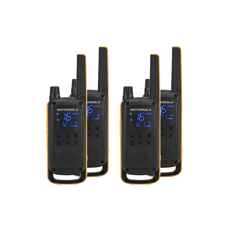 PORTATIFS MOTOROLA TALKABOUT T82 EXTREME QUAD - PMR446 - Protection IPx4 - Livré en pack sacoche de transport de 4 portatifs avec chargeur double, clips ceinture, dragonnes, écouteurs d'oreille et batteries 800mAH NiMH